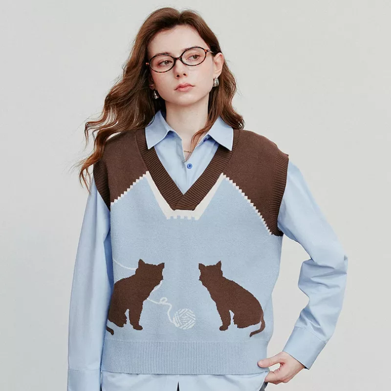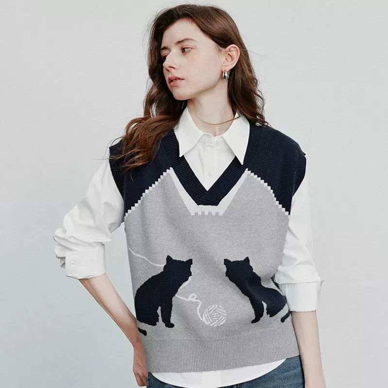 Embrace the cozy vibes with this stylish and comfortable women’s knitted vest. Featuring a unique and playful cat jacquard pattern, this sleeveless pullover sweater adds a touch of fun to your wardrobe. Its V-neck design gives it a flattering look that pairs perfectly with everything from casual jeans to a cute skirt. Whether you’re lounging at home or out with friends, this versatile top is designed to keep you both warm and fashionable.