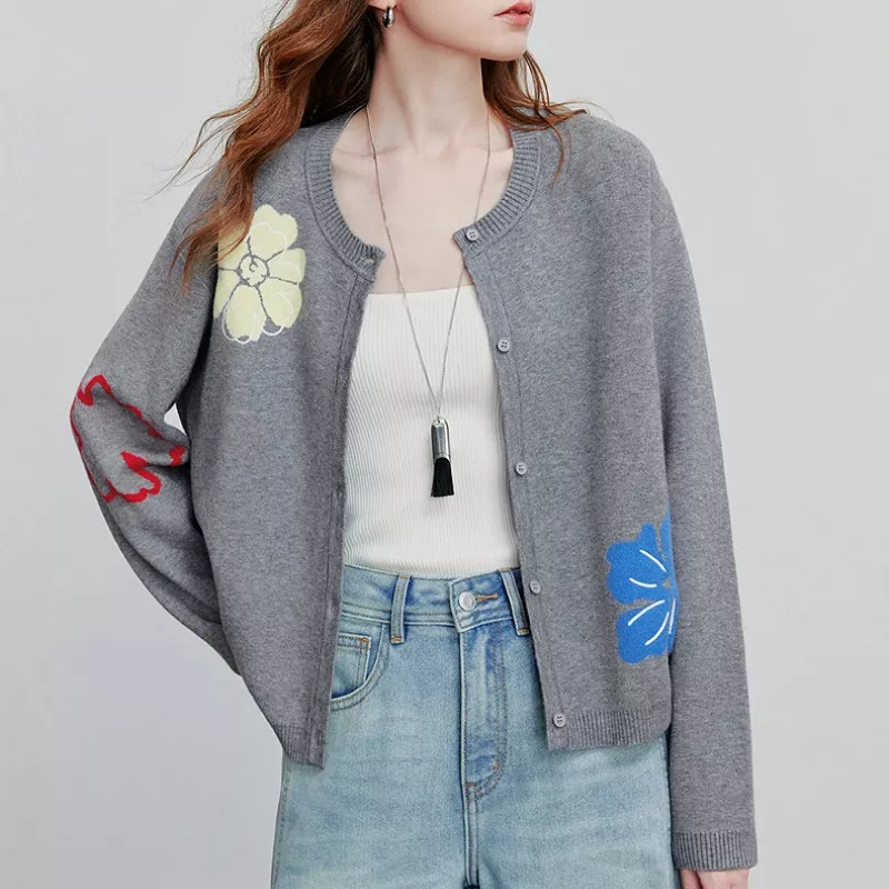 Its appliqué decoration adds a unique and fashionable touch that elevates this cardigan above basic knitwear. Whether you pair it with tailored trousers for a chic office look or throw it over a simple dress for a more laid-back vibe, this sweater has you covered. Its easy-to-wear design and stylish detailing make it the perfect addition to any outfit.