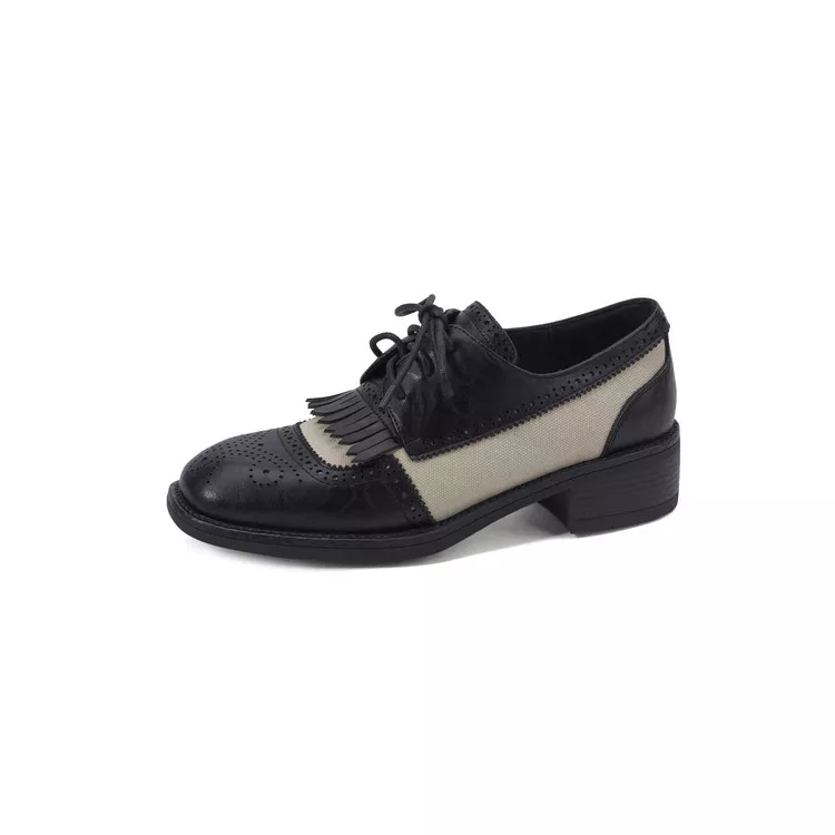 Women’s Leather Chunky Heel Loafers – Lace-Up Round Toe Pumps