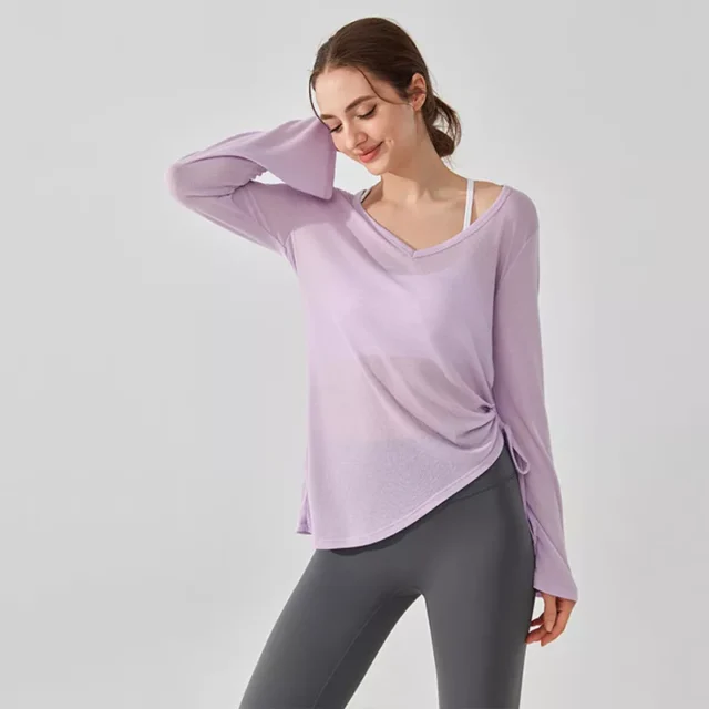 This long sleeve workout shirt is crafted from a breathable blend of polyester and rayon with a soft knitted texture. The fabric is anti-pilling, anti-shrink, anti-wrinkle, and built to last through countless wears and washes. A sexy yet subtle V-neckline gives it a feminine touch, while the loose fit ensures full freedom of movement. Available in classic solid colors—white, purple, pink, and brown—it’s a versatile piece that suits all seasons: spring, summer, autumn, and winter.