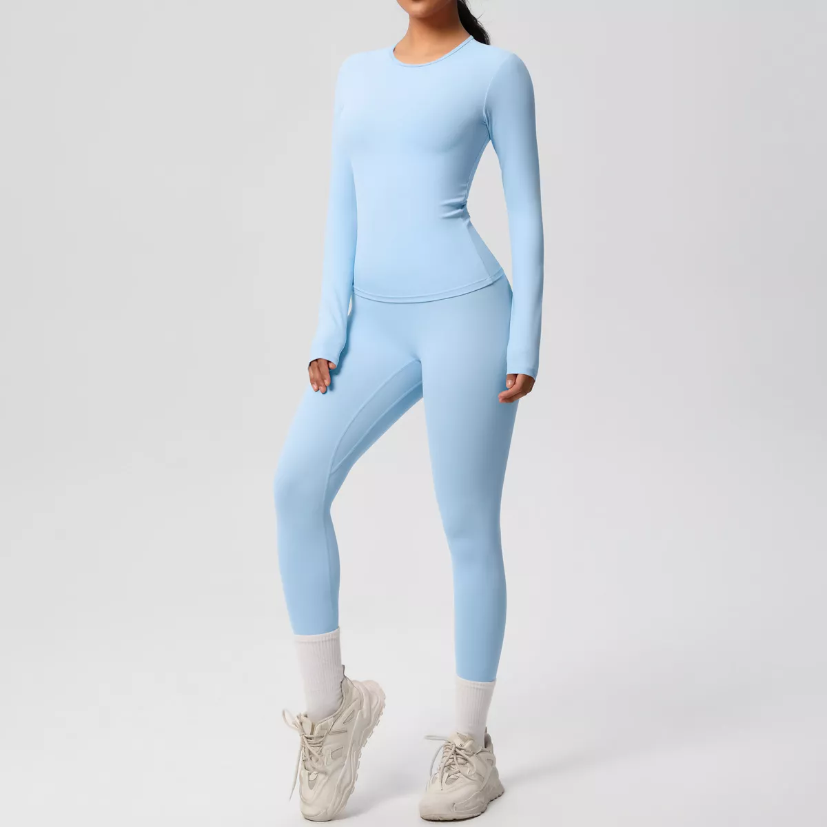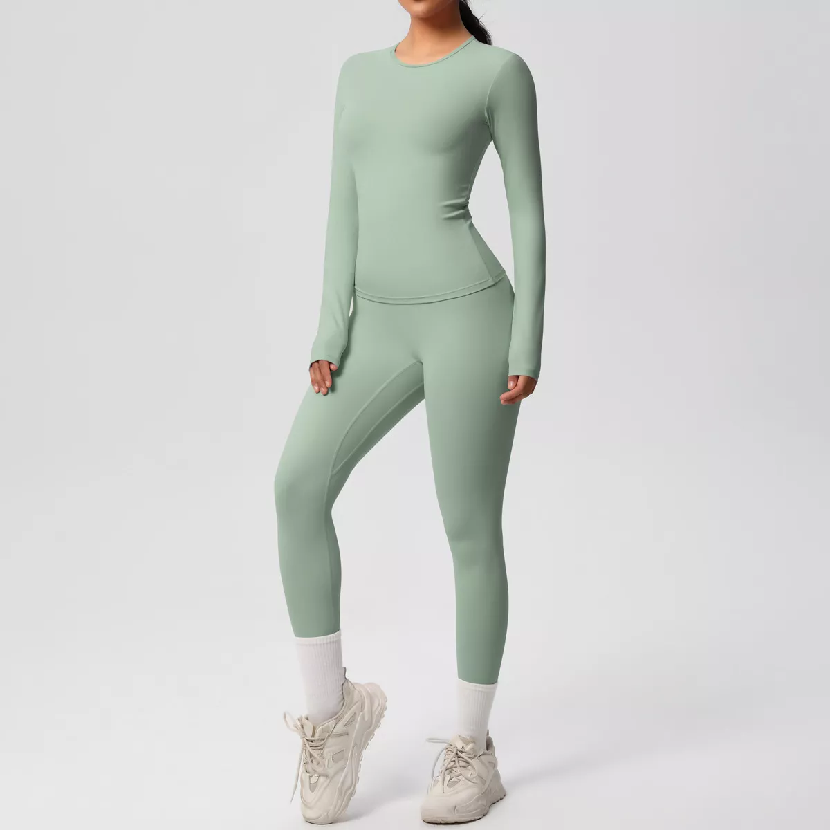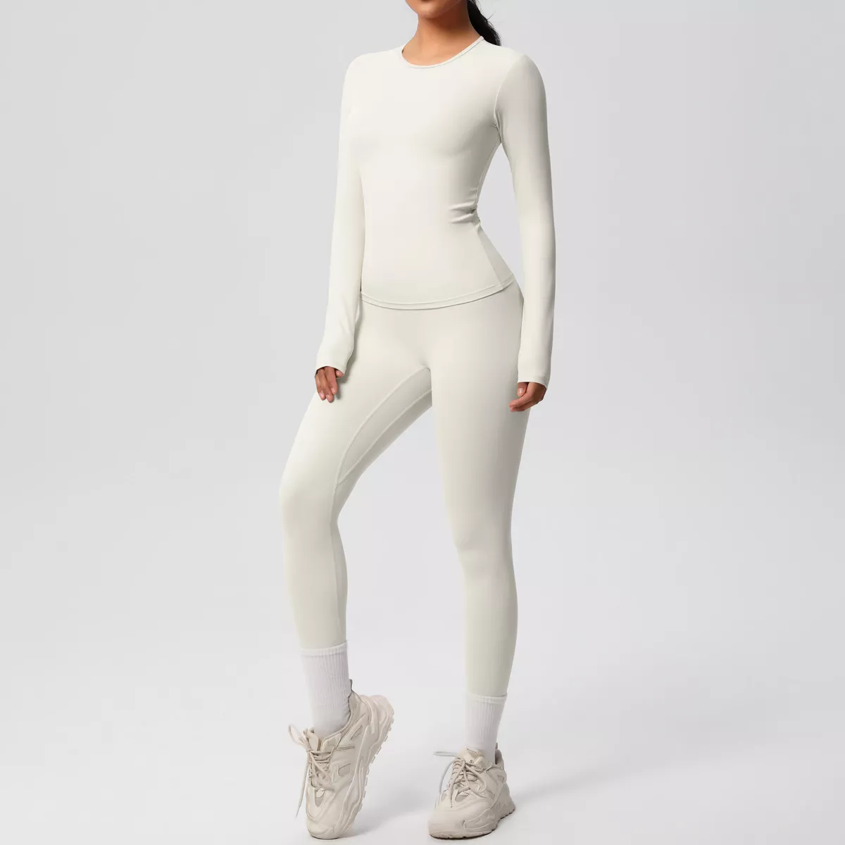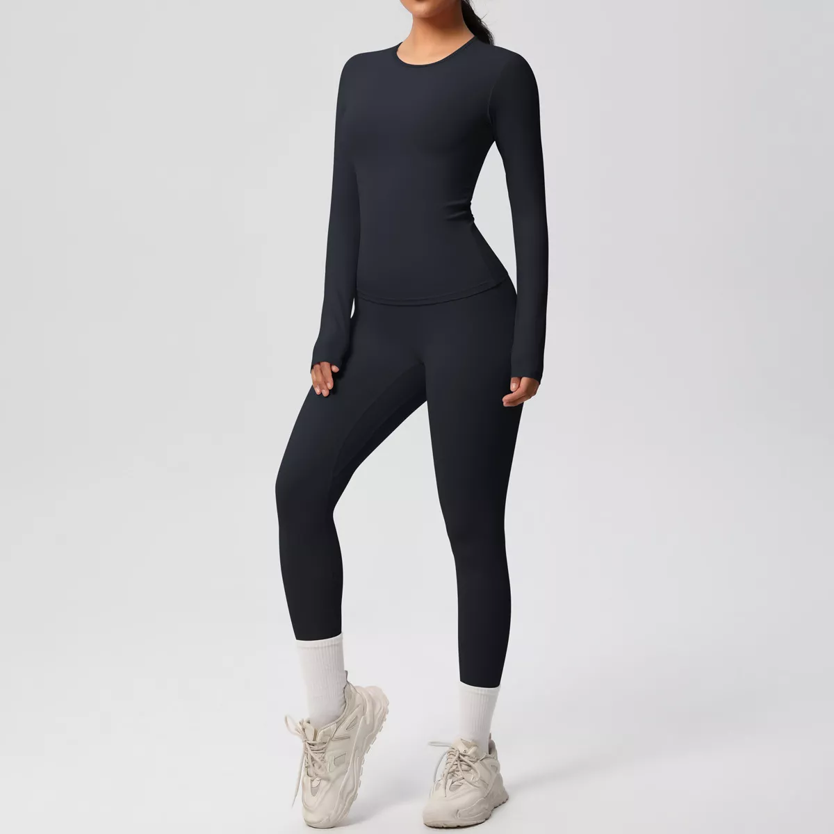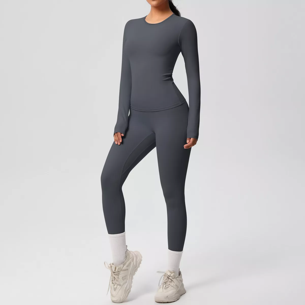 This yoga outfit includes a long-sleeved crop top and slim-fit leggings that shape, support, and flatter your figure. Made from a premium blend of nylon and spandex, the fabric stretches with your body without losing shape. The high-waist design smooths your silhouette and provides gentle compression for a secure yet comfortable fit. The snug cuffs and seamless design ensure everything stays perfectly in place through every move, squat, or stretch.