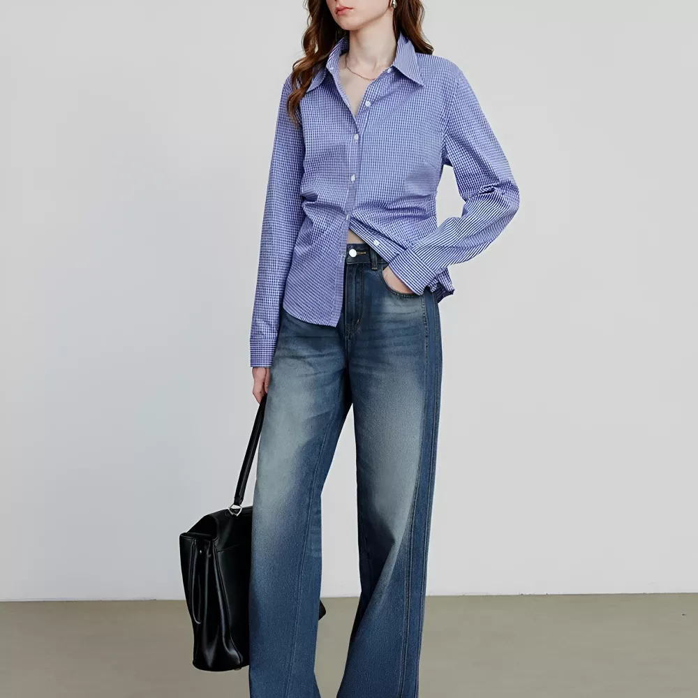 Women’s Slim Fit Plaid Blouse Shirt with Turn-Down Collar for Autumn Style