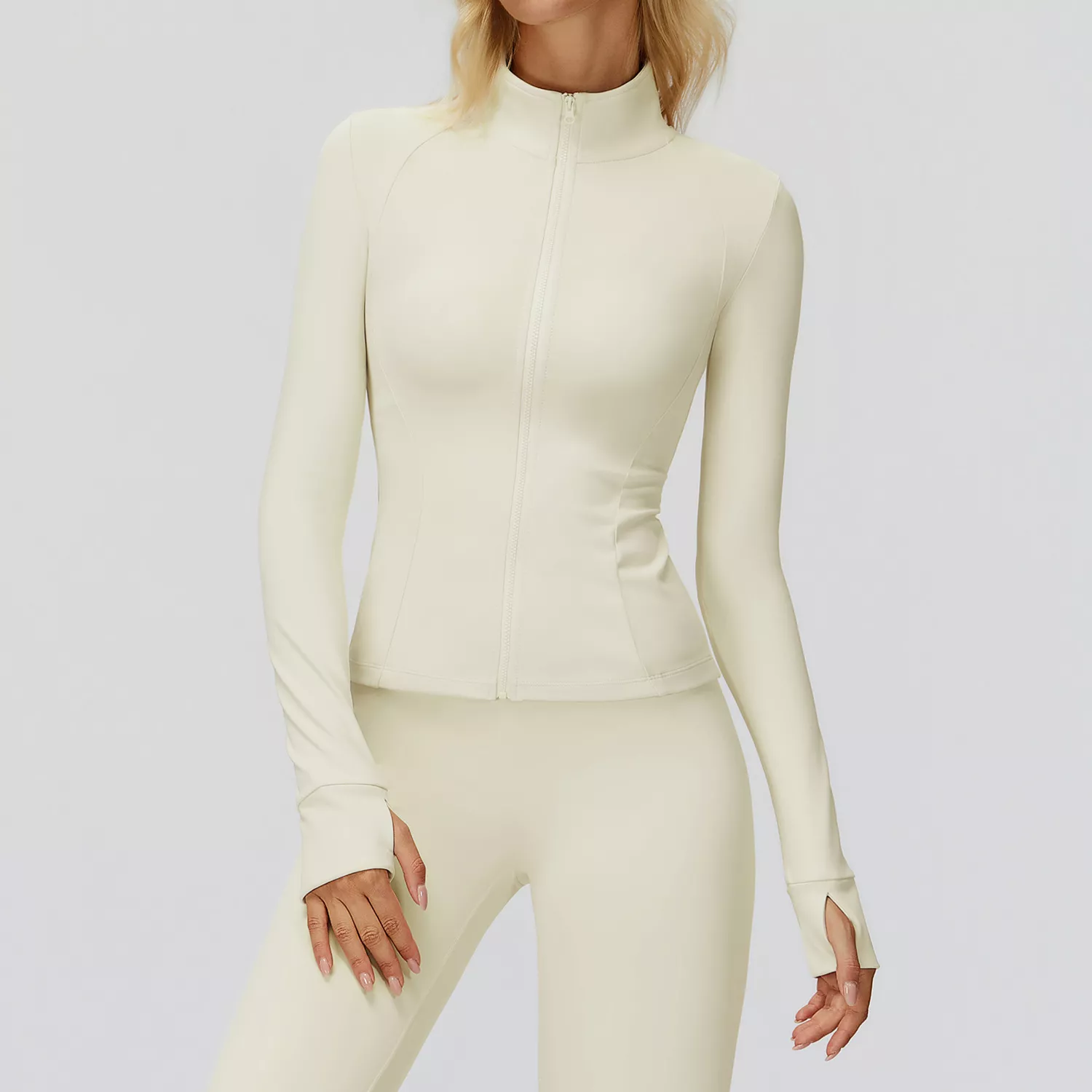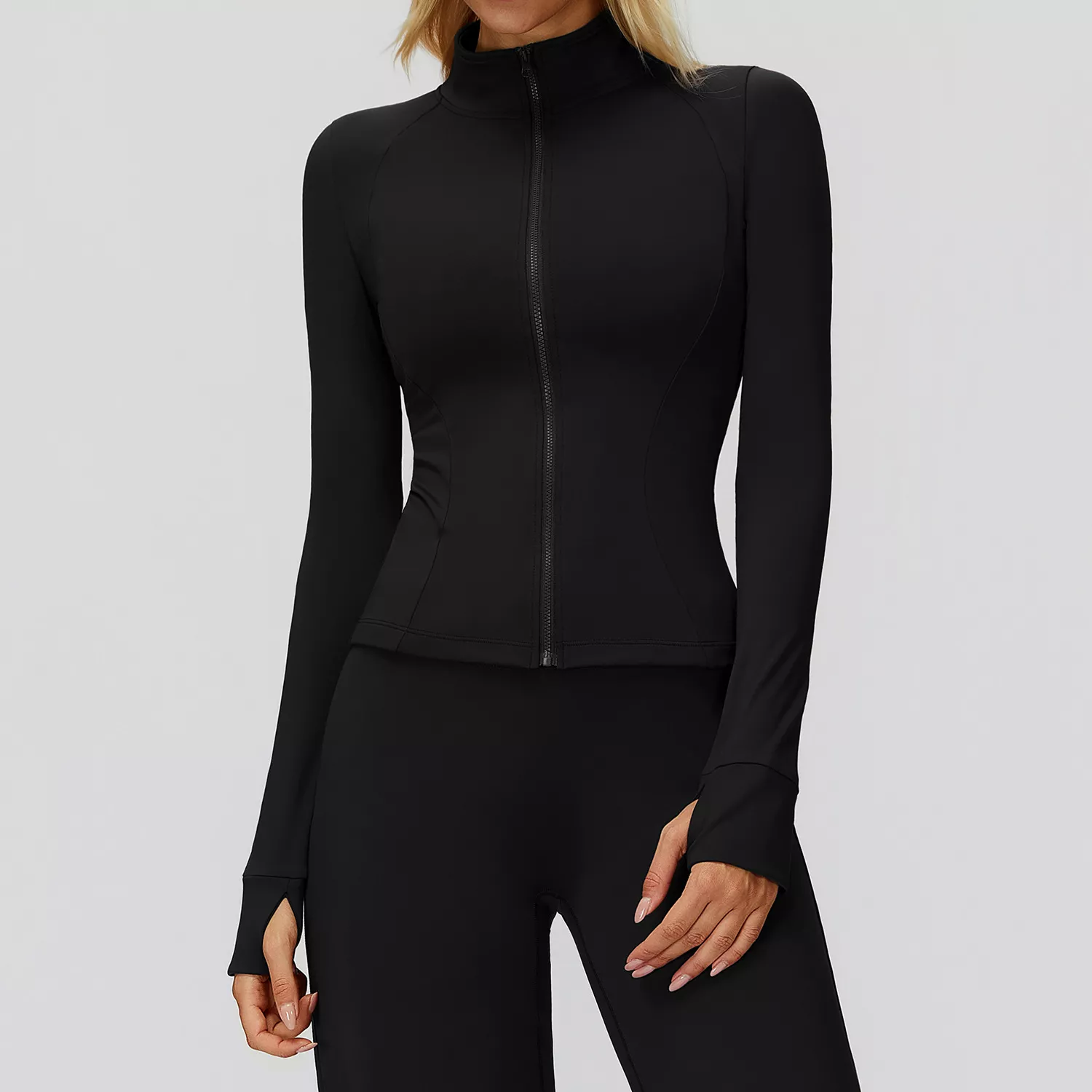 Featuring a stand-up collar and full-length sleeves, this jacket shields you from chilly breezes and light wind. The plush, knit fabric feels soft against your skin while keeping warmth in. The zip-up front allows easy wear and quick temperature control, making it ideal for both workouts and everyday layering. Its sleek, fitted design flatters your silhouette while maintaining full mobility for any type of movement.